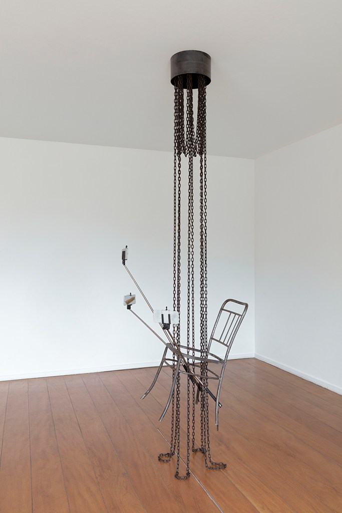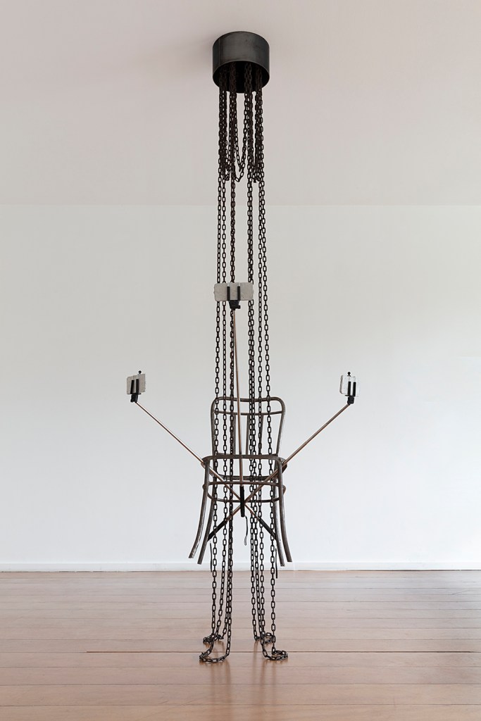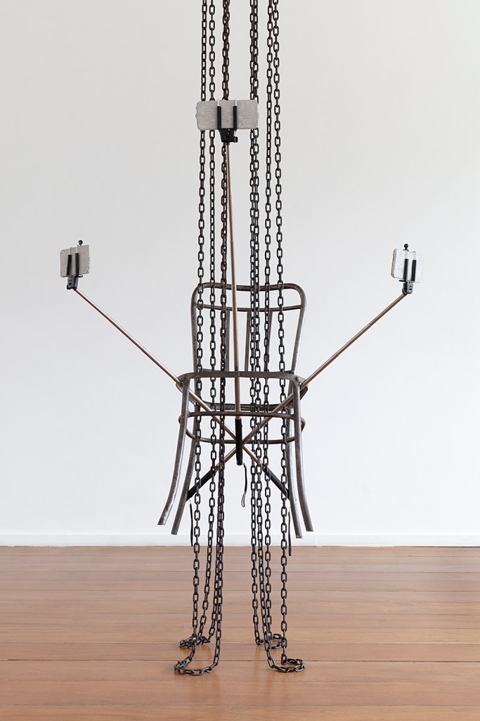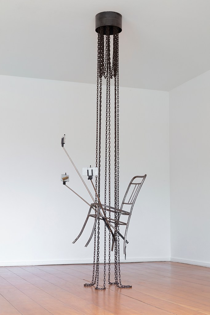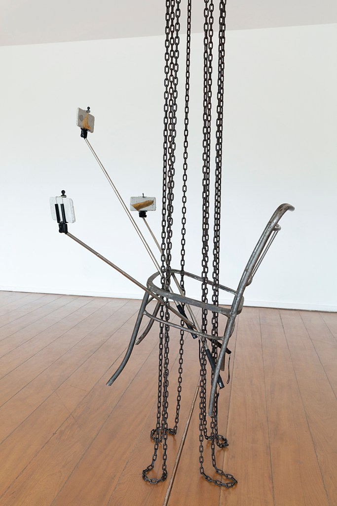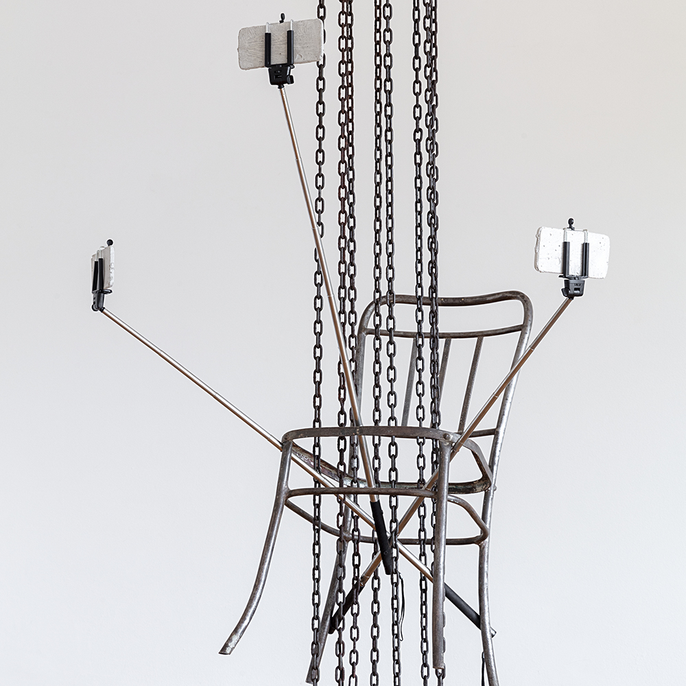 Metal chair, chains, selfie sticks, cement, paper and stainless steel