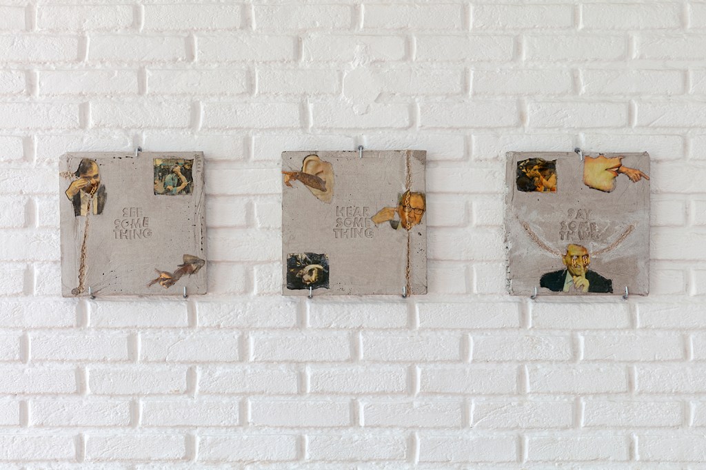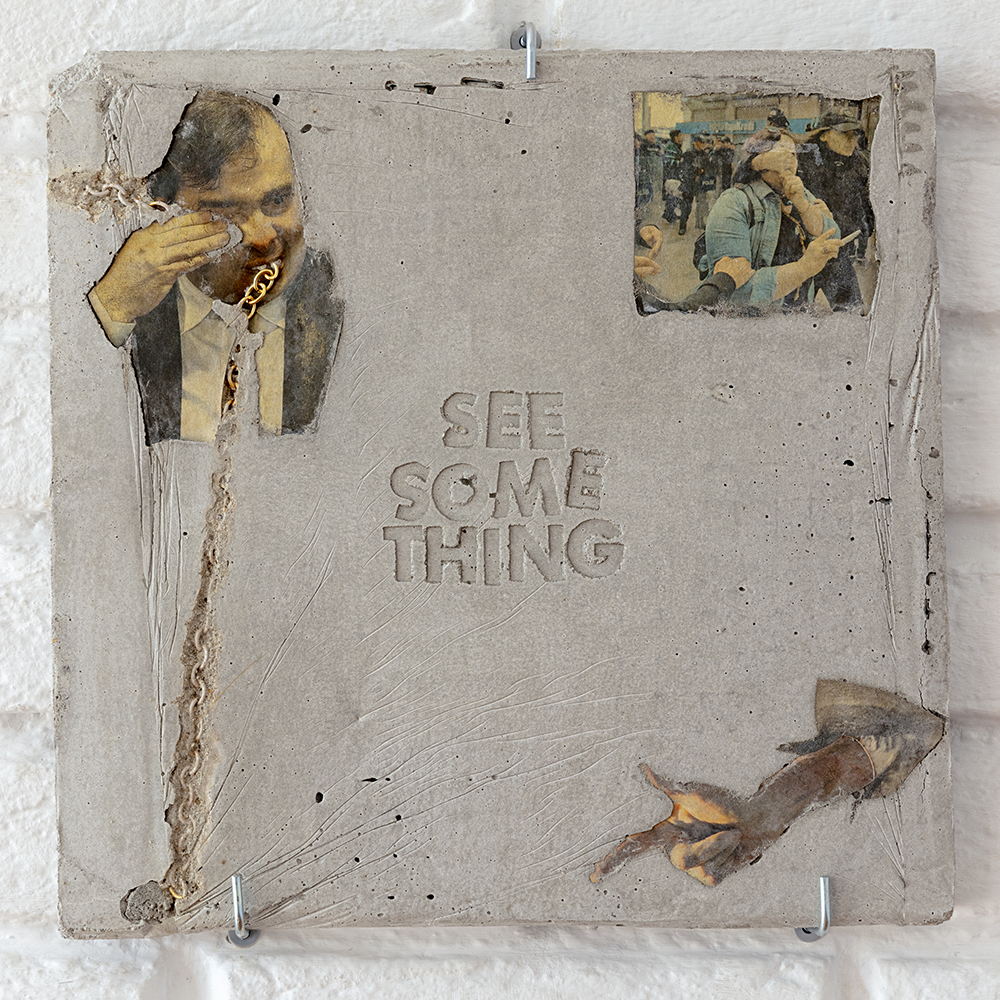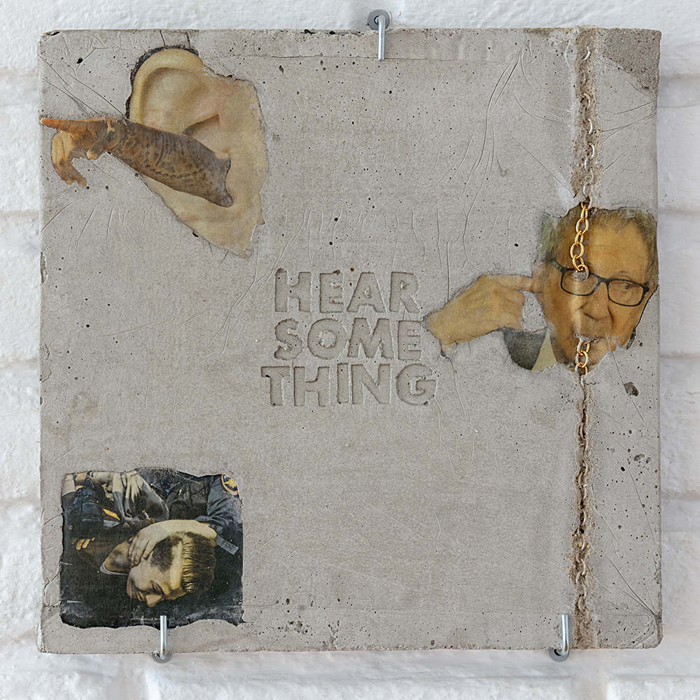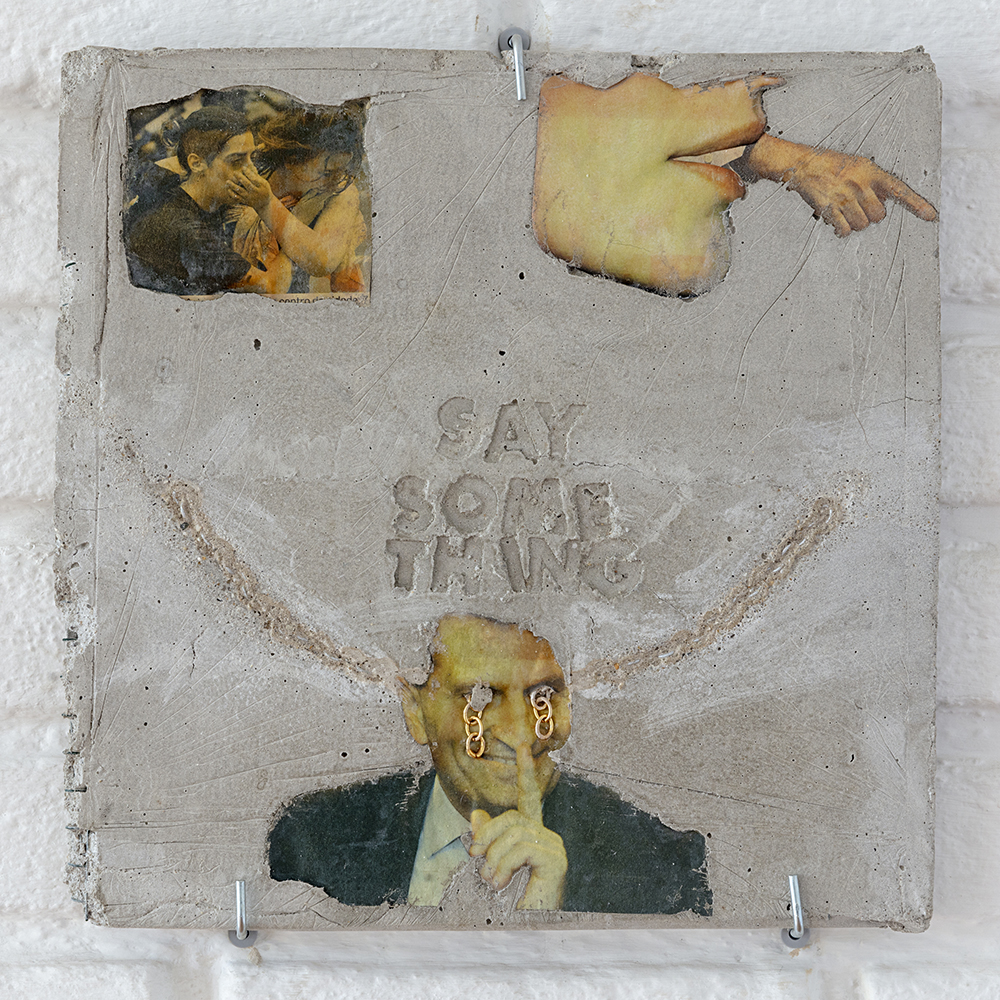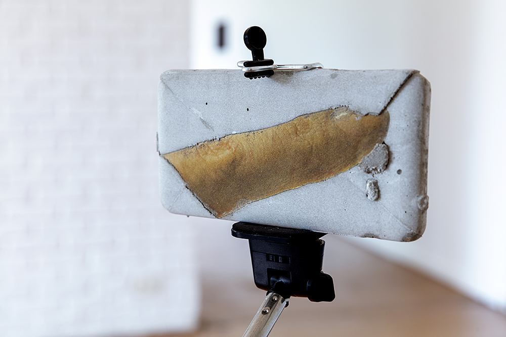 Metal chair, chains, selfie sticks, cement, paper and stainless steel