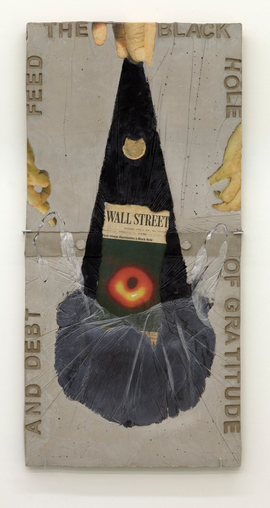 “Feed” highjacks the very first photograph of a black hole, a historical event that took place in April 2019, whose image Rocha Pitta appropriate from the Wall Street Journal. The celestial body is placed inside a plastic bag, while two hands open it, a third one throws a coin. Its trait of absorbing everything around it becomes an anal-cosmic-accumulation device, demanding to be infinitely fed, very grateful for our eternal debt.