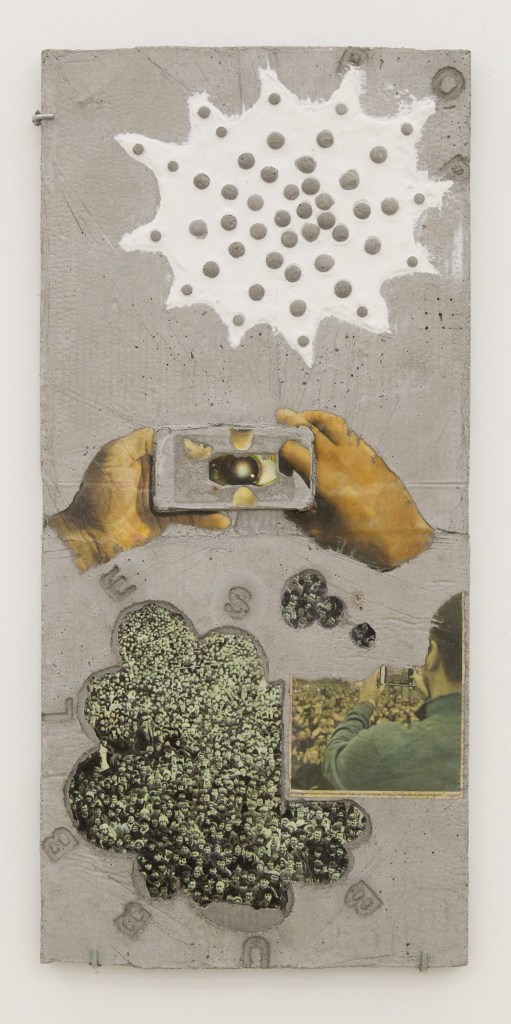This concrete Stela works as a conceptual matrix for the silkscreen: like lithography, it holds and encapsulates the elements of the print, which are not only images, but also objects.