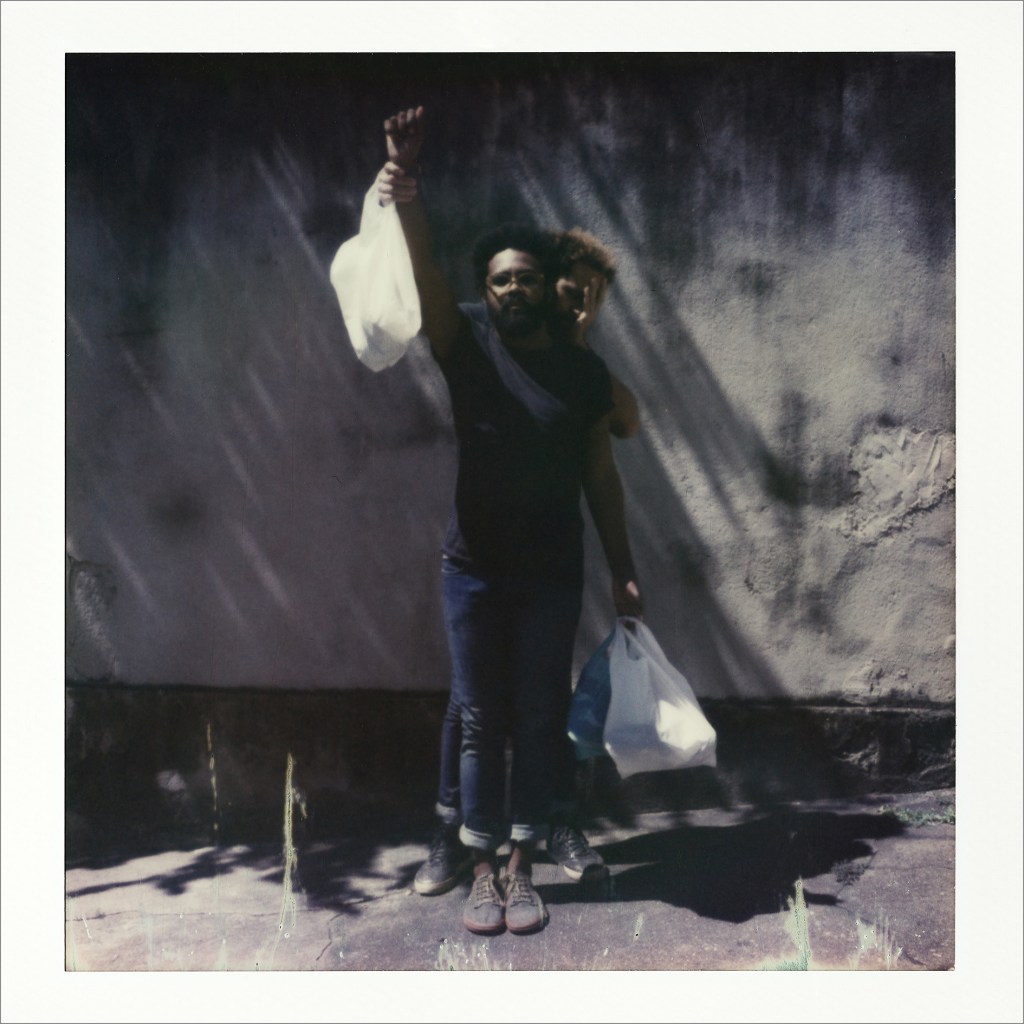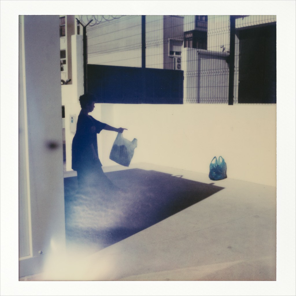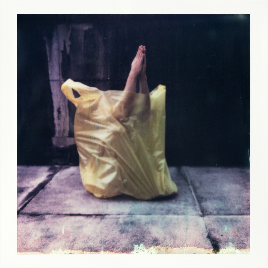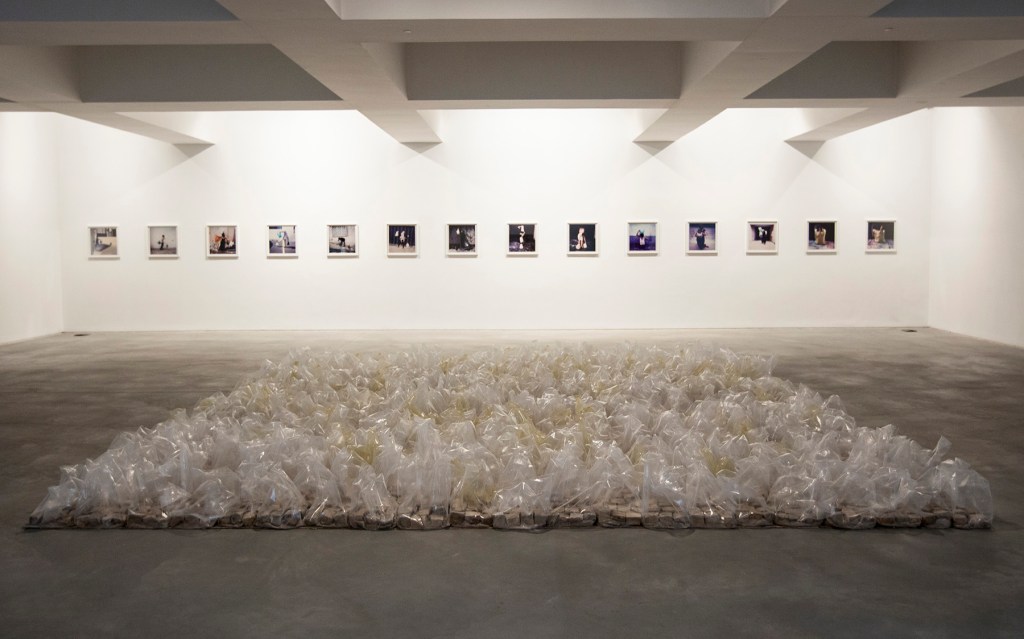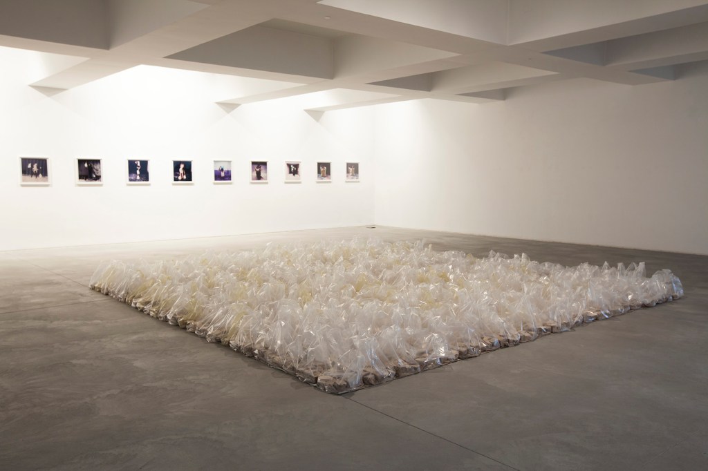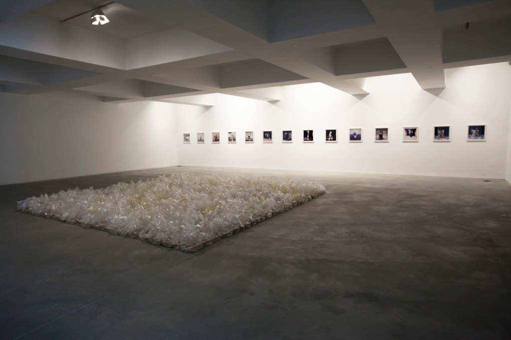 “Winner’s Gallery” ironically substitute trophies for plastic bags. Fourteen carefully studied poses (mostly conflating references from art history with protests) are performed for the camera. A complex vocabulary emerges from the precarious, yet powerful images, where winning is equated to surviving. Bags as trophies are also the subject of the untitled installation, a 5 x 5 meters floor piece of the typical portuguese pavement stone, arranged as if the ground was contained in the transparent bags, a giant prize awaiting to be taken.