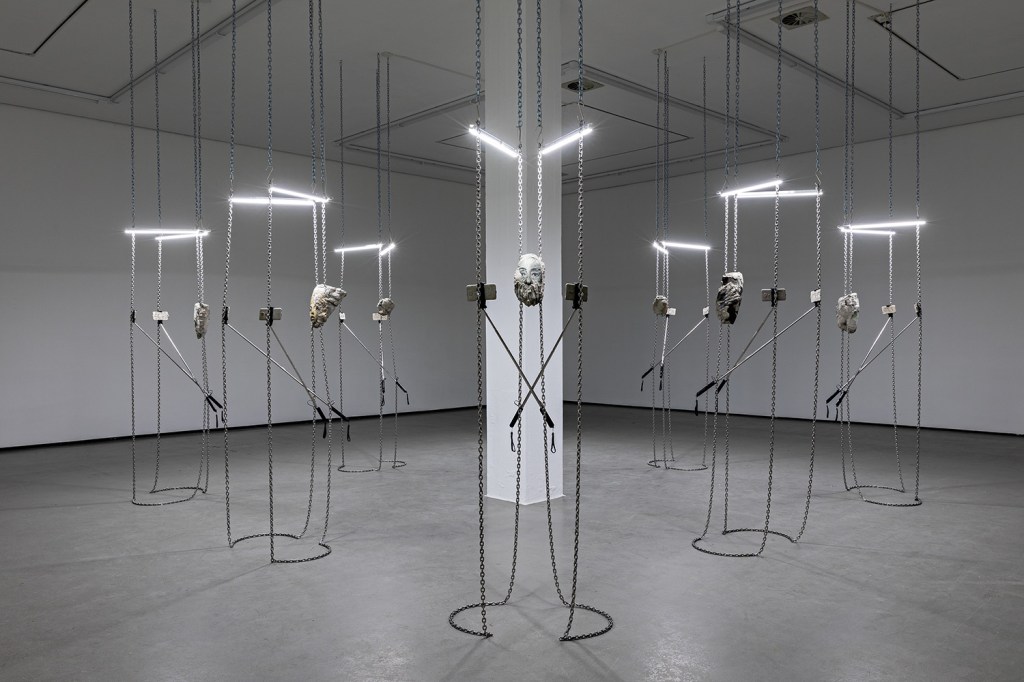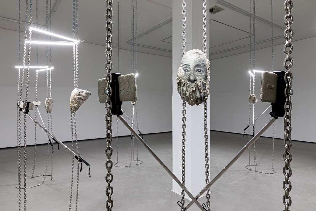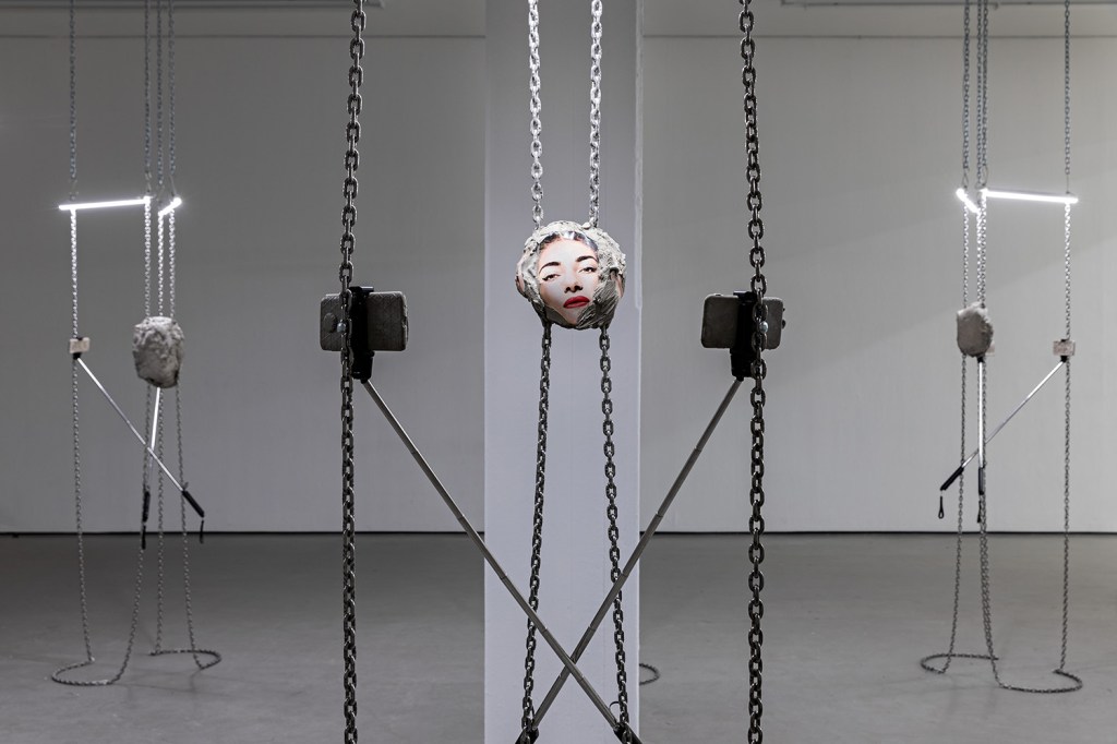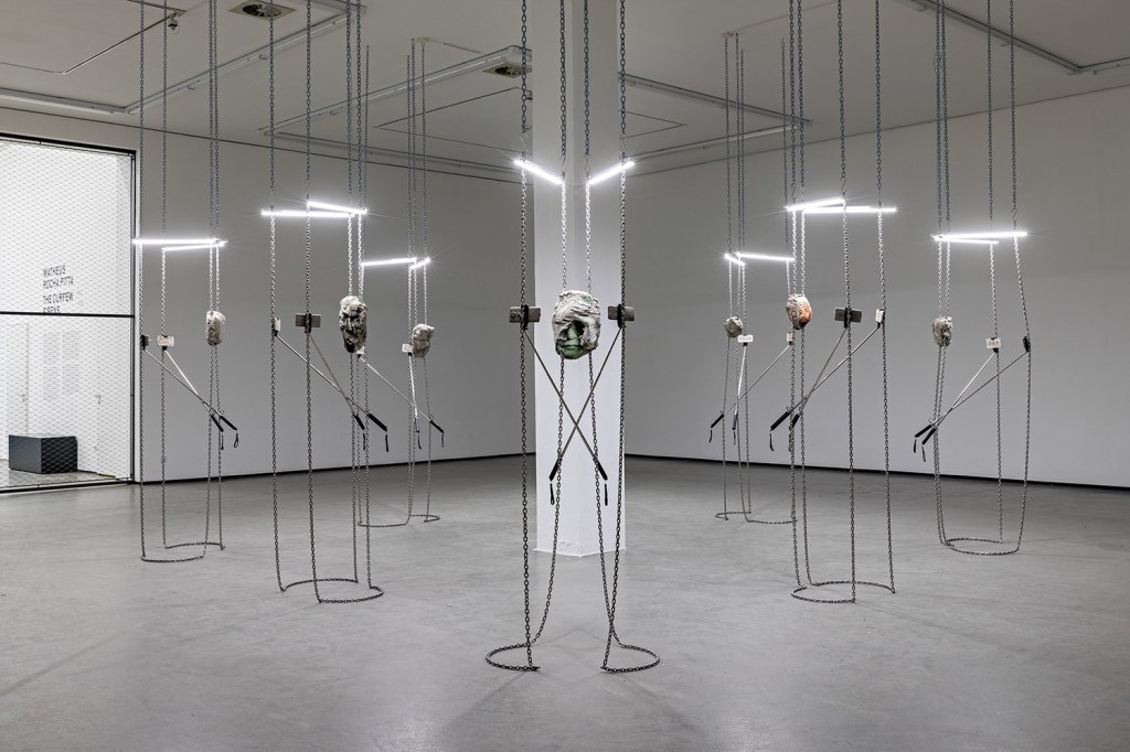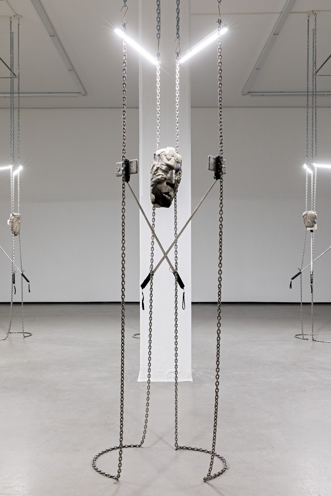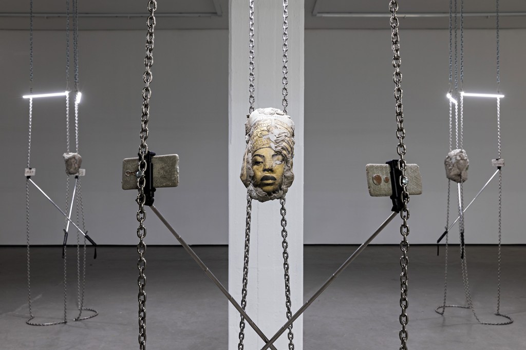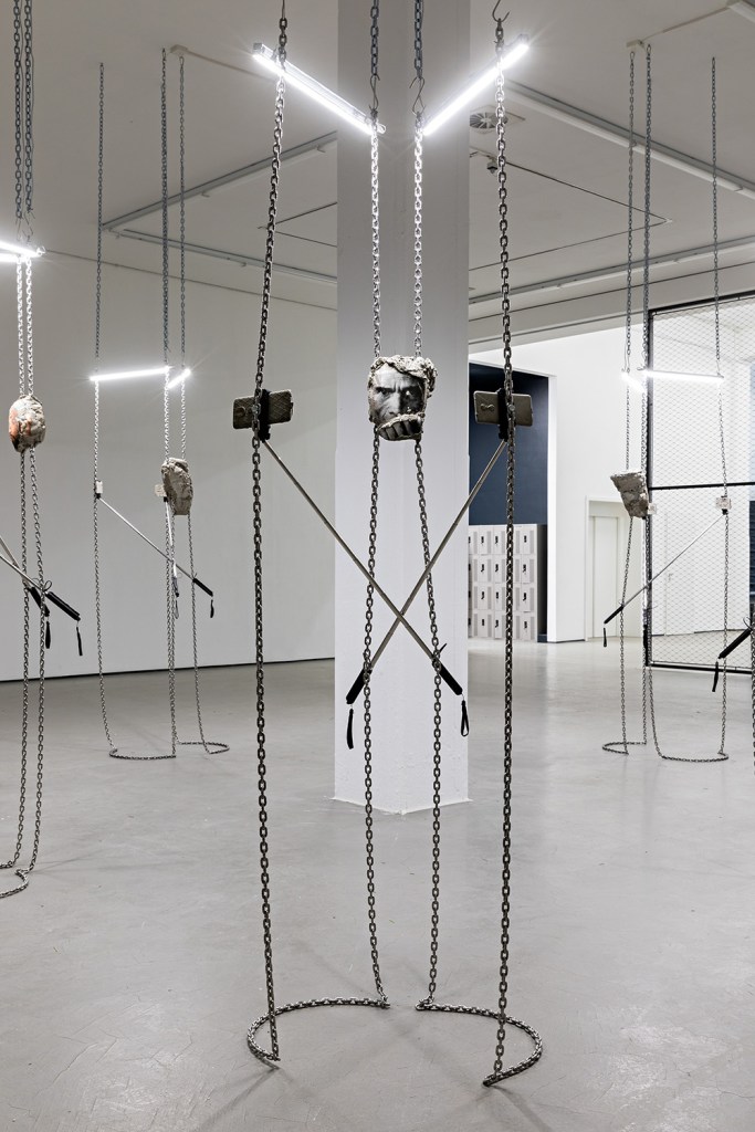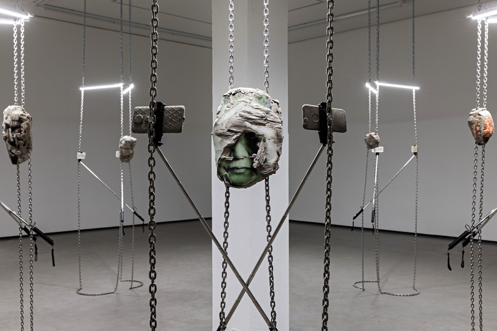 For his show in Hamburg, The Curfew Sirens, Rocha Pitta has developed a group of eight new sculptures called Sirens. The show’s title is already a play on the multiple semantic levels involved in the works. Literally it is an alarm announcing the start of a curfew. “Curfew” is borrowed from old French and means “to cover” as well as “fire,” referring historically to a protective plate for putting out fire. Only gradually did the meaning of the word change from a protective to an authoritarian connotation. In medieval England, the so-called “curfew bell” was used to ring the bell at night to remind people to cover the embers in their homes to prevent fires. The siren itself is not only an alarm sound, but also a mythical creature from ancient Greece, which attracts sailors passing by with its beguiling singing and plunges them into ruin. With the word combination The Curfew Siren, Rocha Pitta adds attributes to his sirens that alternate between state control and protective gesture.