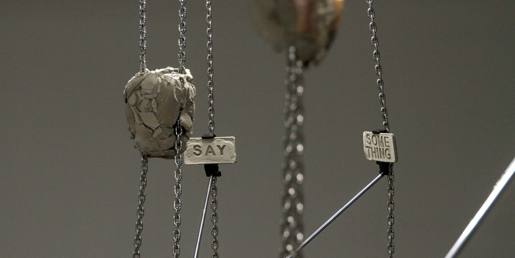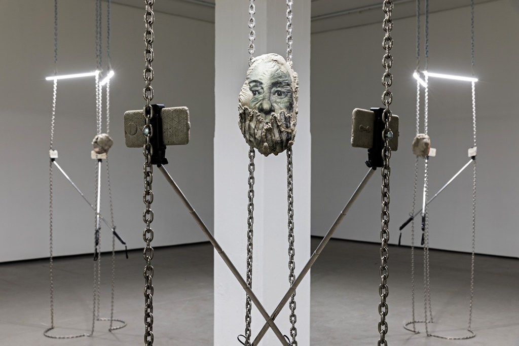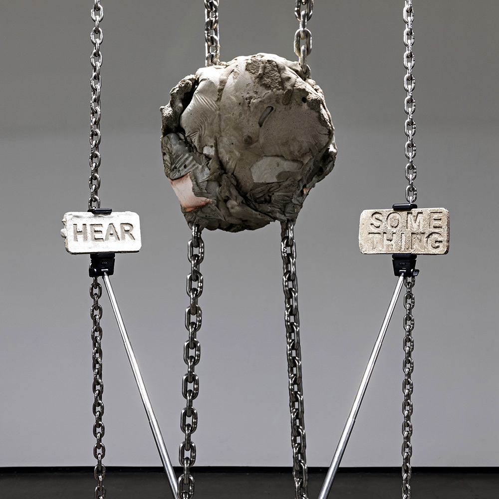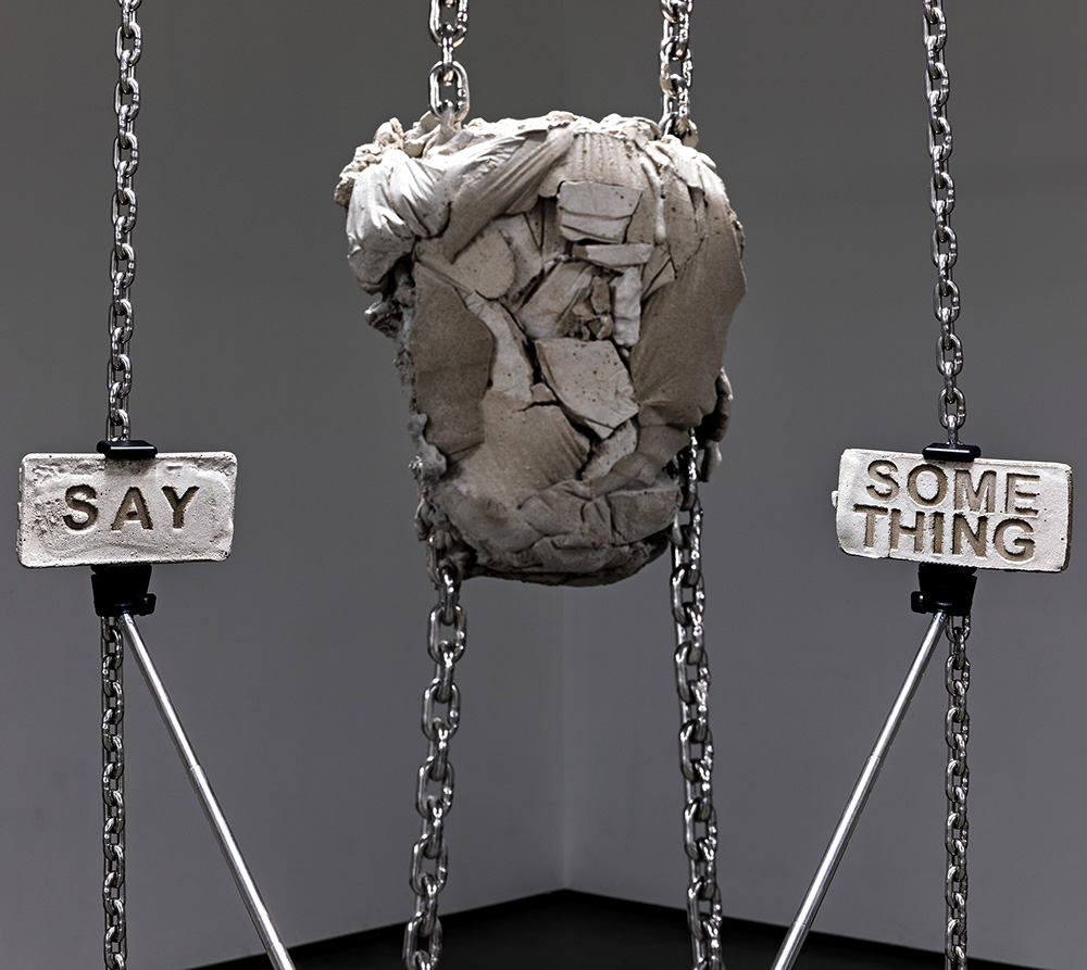 The artist likewise considers the selected gestures in relation to the urge for constant expression of opinion and streaming from social media and an increasing surveillance mentality. Each Siren is holding two selfie sticks with stone cell phones on whose screens, in contradiction to the gestures on display, can be read “Hear Something!,” “See Something!,” and “Say Something!” An ambivalent action-reaction loop is thus developed within the work and with the audience as it remains questionable who is being challenged to hear, see, and speak.