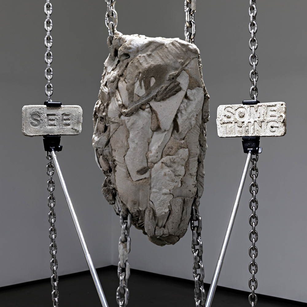 The examination of gesture plays a central role in Matheus Rocha Pitta’s works. As articulations of the body and language, gestures have far-reaching ethical and political implications. Over many years, Rocha Pitta has amassed an extensive archive of news clippings organized by quotidian gestural expression and place of origin. He arranges the material in multi-layered compositions on poured concrete slabs of different sizes and shapes. With his “petrified” collages, Rocha Pitta constructs stories, memories, and scenarios that reflect authoritarianism, misinformation and injustice.